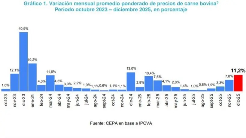 El informe del CEPA muestra que no se trató de un salto aislado. Desde marzo de 2025, la variación interanual del precio promedio de la carne se mantuvo de forma persistente por encima de la inflación. Tras una moderación relativa durante el invierno, desde octubre la dinámica volvió a acelerarse y se profundizó en el último bimestre del año.