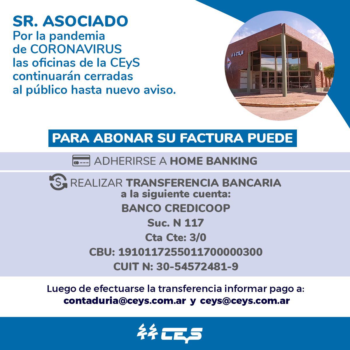 *Podés pagar tus servicios de forma rápida y segura a través de la página web de la cooperativa (www.ceys.com.ar) ingresando a la pestaña «Pagos online», o a través de transferencia bancaria, depositando el monto de la factura a la cuenta de la cooperativa y luego enviando un correo electrónico a [email protected] dando aviso del pago para poder reflejarlo en nuestro sistema (este último paso es fundamental para evitar inconvenientes).