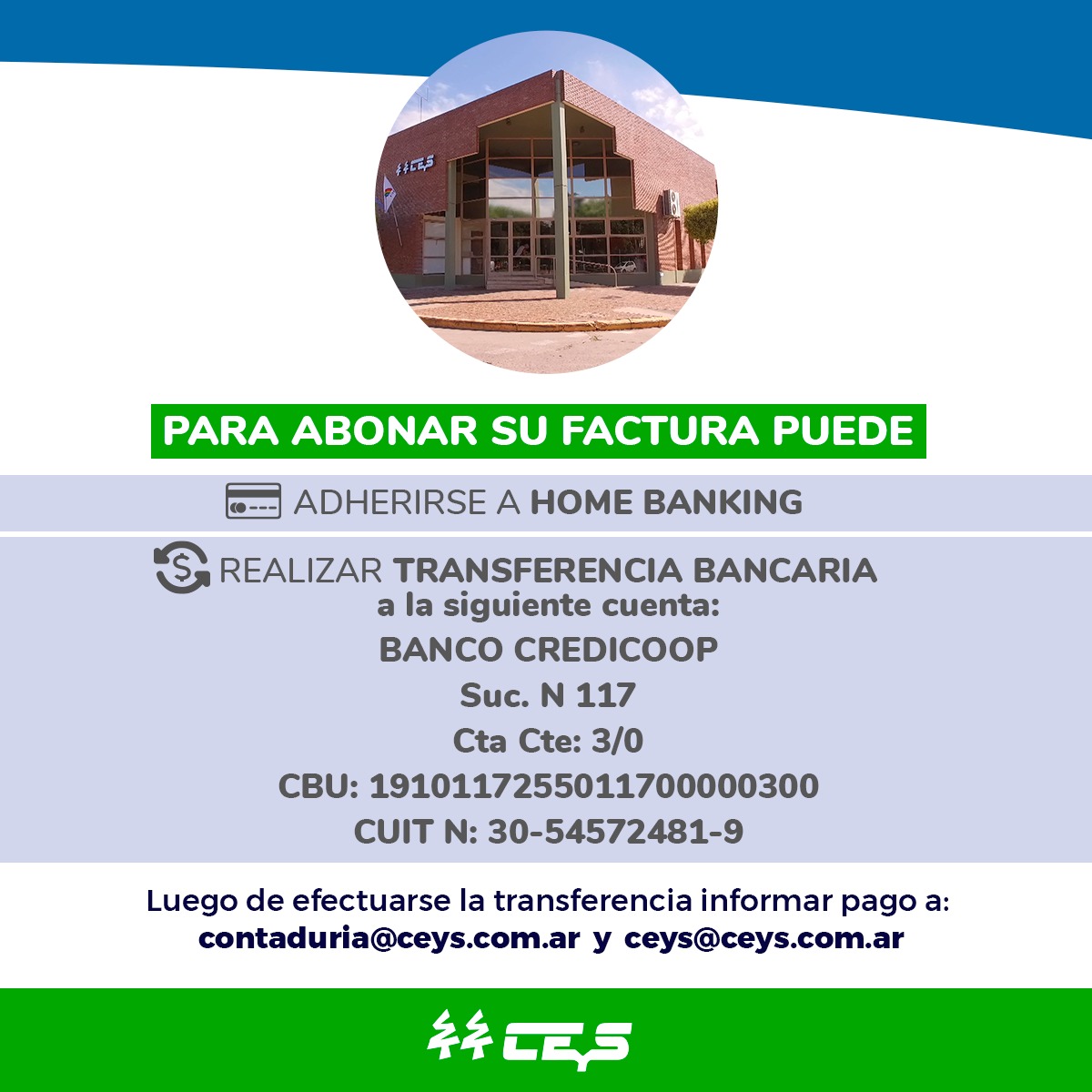 También aseguran que «Es fácil, rápido y seguro». A través de las redes sociales,  manifiestan que «Podés adherir los servicios al home banking (no es débito automático, sino que todos los meses el titular tiene que habilitar el cobro). Podés utilizar cuenta DNI, que funciona igual que el sistema de home banking, y además sirve para pagar las cuentas de forma presencial. Podés pagar tus servicios de forma rápida y segura a través de la página web de la cooperativa (www.ceys.com.ar) ingresando a la pestaña «Pagar online», o a través de transferencia bancaria, depositando el monto de la factura a la cuenta de la cooperativa y luego enviando un correo electrónico a [email protected] dando aviso del pago para poder reflejarlo en nuestro sistema (este último paso es fundamental para evitar inconvenientes).