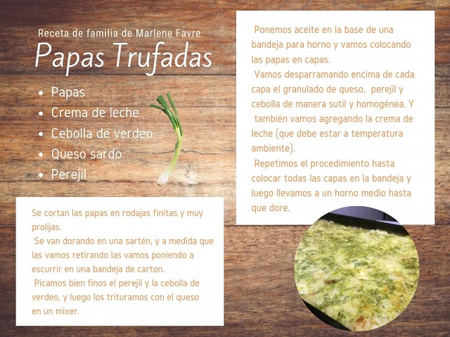 Hoy las receta se comparten, dejan de estar latiendo en lo íntimo del seno familiar y se muestran a todos, así cada uno que se sienta parte de esta gran familia Piguense, por adopción o por raíces las consideren propias .Esta en particular es la de una de las familia que colaboraron revivir aquellas comidas rememoraba los recuerdos de muchos. La receta de la Familia de Marlene Favre PAPAS TRUFADA. Agradezco a todos los organizadores de la propuesta COCINA PIGÜENSE por permitir acercar eta receta y a cada Pigüense que nos hizo sentir parte de la ciudad.