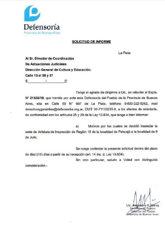 Desde la Defensoría, contestaron enviando copia fiel, de la solicitud de informe enviada por dicha Defensoría al Director de Actuaciones Judiciales de la Dirección General de Cultura y Educación (DGCyE) ubicada en la ciudad de La Plata. Dicha solicitud, insta a la Dirección de Cultura y Educación, que informe los motivos por los cuales se decidió trasladar la Jefatura pehuajense a la localidad de 9 de Julio.En esta línea, el Diputado Provincial Avelino Zurro había presentado en la Cámara de Diputados de Buenos Aires, el Proyecto de rechazo al traslado de la Jefatura Regional de Educación Región XV de Pehuajó. Este proyecto no pudo ser tratado porque los diputados de Cambiemos Pro-UCR, no dieron sus votos.