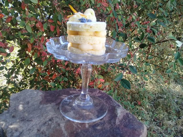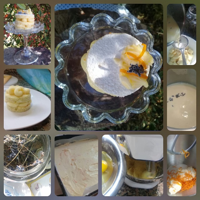 Dejar enfriar en heladera y cortar con cortantes redondos. Para la Ganache, calentar la crema de leche con las flores de lavanda, colarla sobre el chocolate picado, dejar unos segundos y luego comenzar a revolver. Dejar enfriar, colocarla en manga con pico rizado, formar rulos por encima de una de las porciones de biscuit, colocar otra encima y lo mismo con la tercera capa espolvoreada con azúcar impalpable. Terminar con un copete, cascaras de naranja confitadas y una flor de lavanda. Atrevete a experimentar con sabores únicos, te va a encantar!