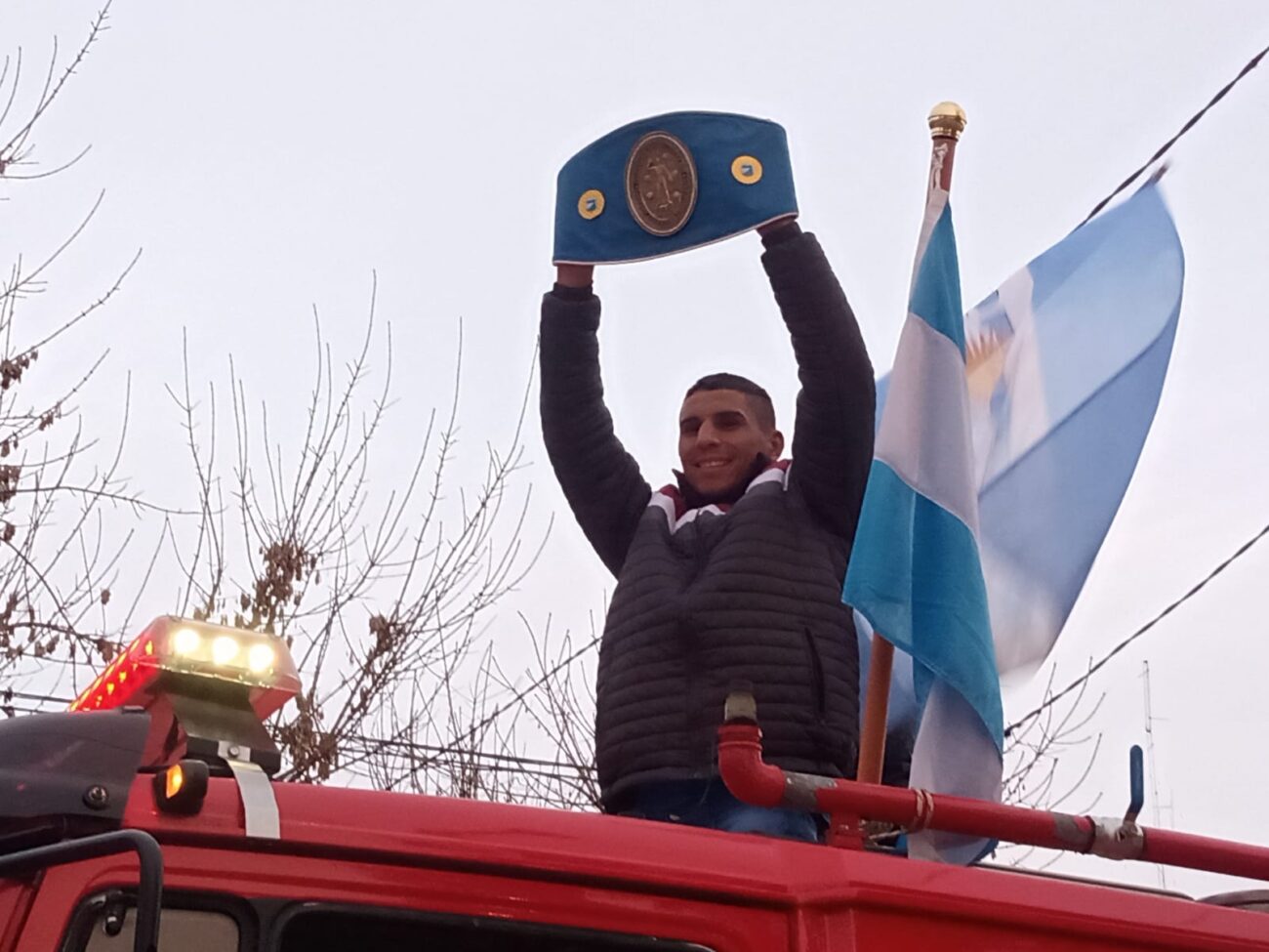Desde allí, el deportista encabezó una caravana a bordo de una autobomba de Bomberos Voluntarios, recibiendo el cálido saludo de toda la comunidad.