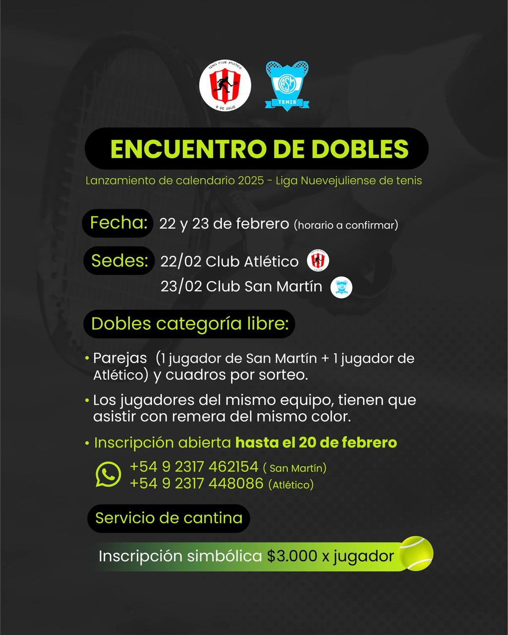 Es un encuentro amistoso, en la que las duplas estarán conformadas por un jugador de cada club y el mismo servirá para darle comienzo al año tenístico en la ciudad. En ambas fechas habrá servicio de cantina.