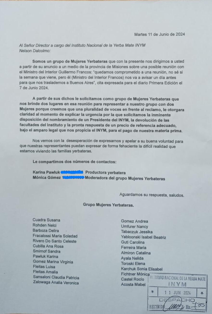 Luego de encuentros y espacios compartidos por las pocas que pudieron acercarse a las manifestaciones como el “Yerbatazo” en Buenos Aires o el reclamo frente al INYM promocionado por Productores Autoconvocados, el grupo consensuó la primera acción de visibilización. La publicación de una nota al INYM solicitando como grupo de mujeres dos espacios para una reunión con el ministro del Interior Guillermo Francos, que el director a cargo había mencionado en un medio local.