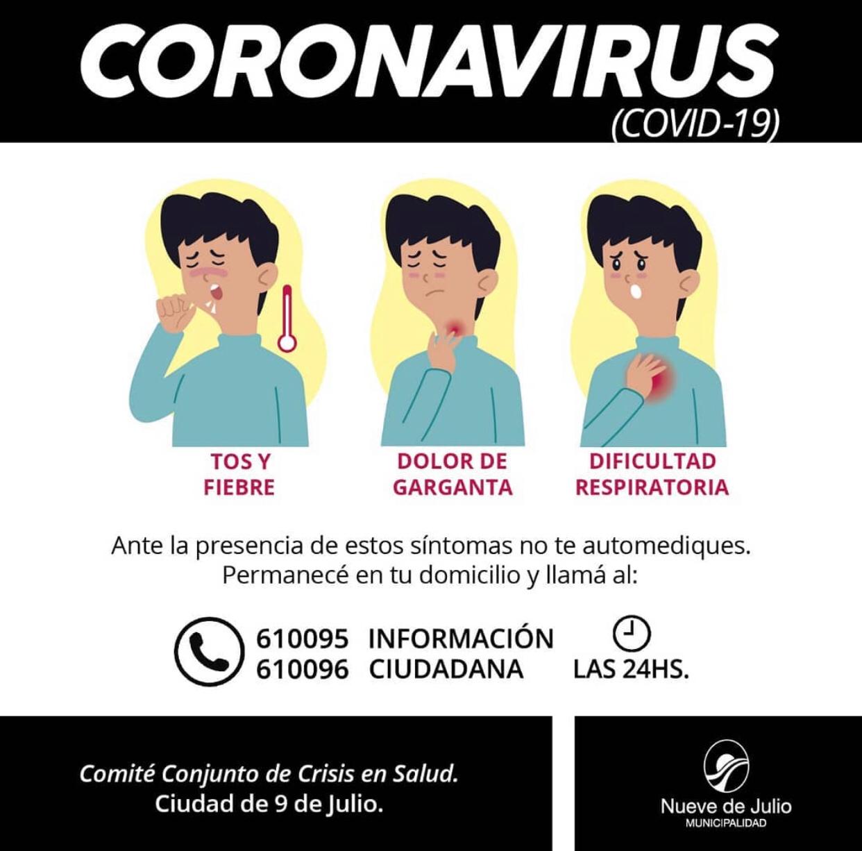 La Municipalidad de 9 de Julio recuerda a la comunidad que están disponibles las dos líneas telefónicas para orientar a los vecinos en lo que refiera a dudas surgidas ante eventuales síntomas relacionados con la enfermedad, como fiebre, dolor de garganta, falta de aire o tos.