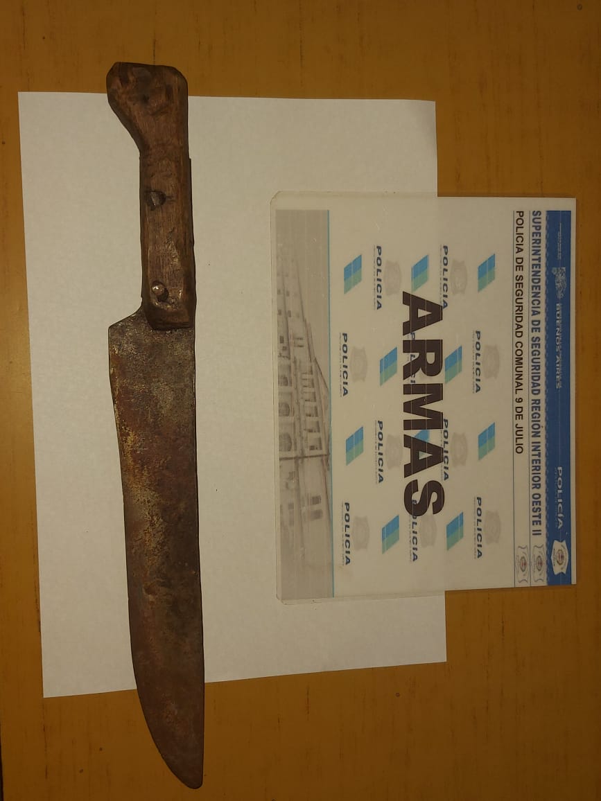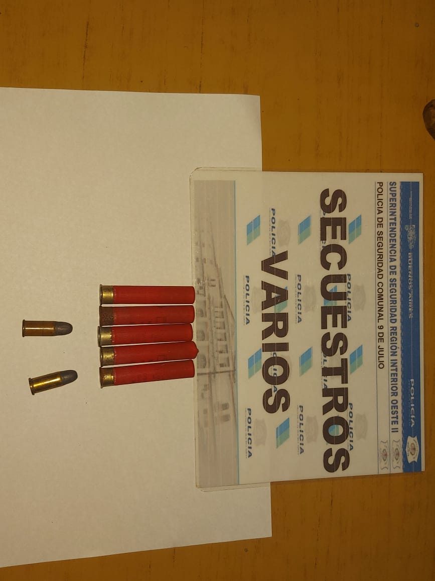 Parte policial: Personal policial de la Estación de Policía de 9 de Julio, junto a personal de la SUB DDI Bragado, Destacamento Quiroga y Puesto de Vigilancia de la Niña, en relación al hecho acaecido con fecha 03 de Febrero del corriente año en curso, en donde denunció un masculino de 48 años haber sido amenazado de muerte por otro sujeto de 26 años en un domicilio de la Niña, quien para ello le exhibió un arma blanca, se procedió a dar cumplimiento a orden de allanamiento dispuesta por el Juzgado de Garantías 2 de Mercedes para con el domicilio del agresor en Planta Urbana de La Niña, el cual cumplimentado se secuestra dos balas calibre 38 mm y 5 cartuchos calibre 36, como así también cuchillo utilizado por imputado para amenazar de muerte a víctima, en dicho domicilio se hallaba imputado a quien se lo trasladó hasta la Estación de Policía de 9 de Julio, donde tras ser notificado de la formación de la causa por el delito de Amenazas Calificadas y previas diligencias de rigor recuperó la libertad. Intervino UFI 5 de Mercedes.