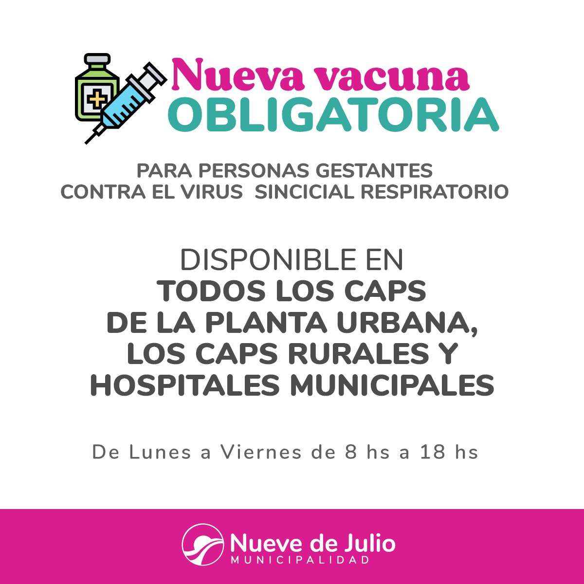 La Municipalidad de 9 de Julio, a través del área de Inmunizaciones de la Secretaría de Salud, recuerda que la nueva vacuna contra el Virus Sincicial Respiratorio (VSR) aprobada por ANMAT, e incorporada al calendario nacional de vacunación; se encontrará disponible desde este próximo lunes 18, en todos los CAPS de planta urbana, las localidades y el medio rural; así como en los Hospitales Municipales de Dudignac y Facundo Quiroga.