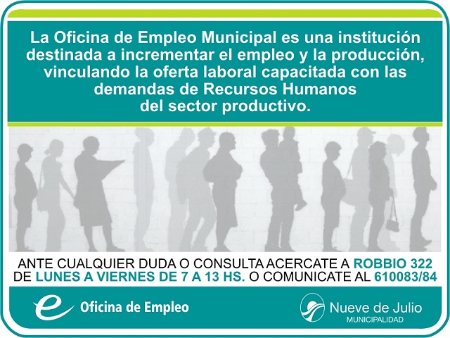 La Oficina de Empleo Municipal es una institución destinada a incrementar el empleo y la producción, vinculando la oferta laboral capacitada con las demandas de recursos humanos del Sector Productivo.