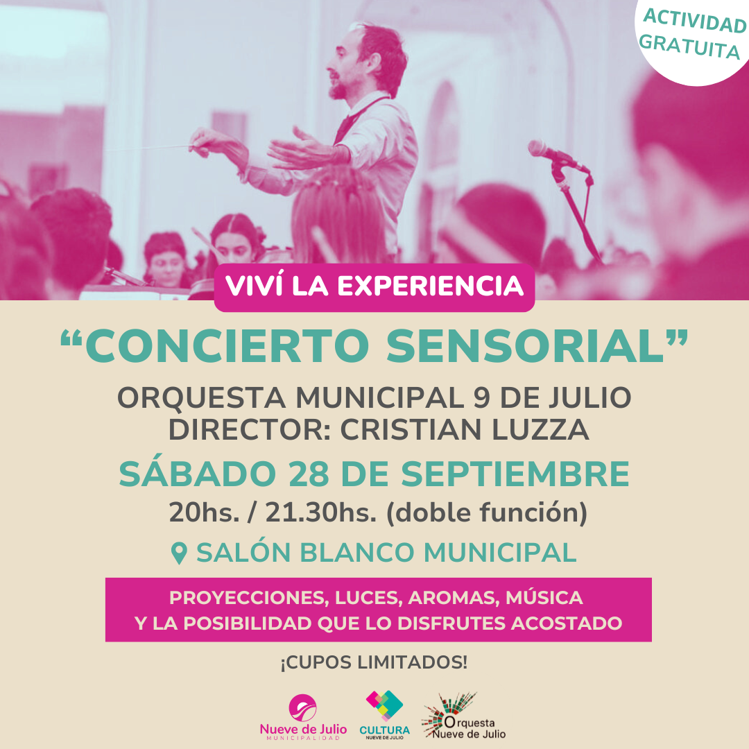 En el marco de los festejos y la celebración del 8vo. aniversario de la Orquesta Municipal 9 de Julio, agrupación dirigida por Cristian Luzza, la dirección de Cultura de la Municipalidad de Nueve de Julio ha programado el “Primer concierto sensorial”, cita que tendrá lugar el sábado 28 de septiembre en el Salón Blanco Municipal con doble función, a las 20 y a las 21.30 hs.