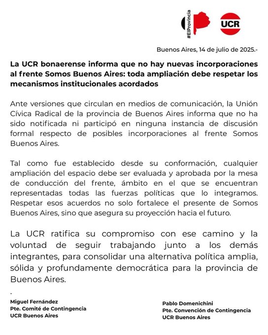 Desde la UCR salieron a desmentir: “Ante versiones difundidas en medios, informamos que no existen nuevas incorporaciones al frente Somos Buenos Aires. Cualquier ampliación debe respetar los mecanismos institucionales acordados por todas las fuerzas políticas del espacio. Sostenemos una construcción democrática, transparente y con reglas claras” mencionaron.