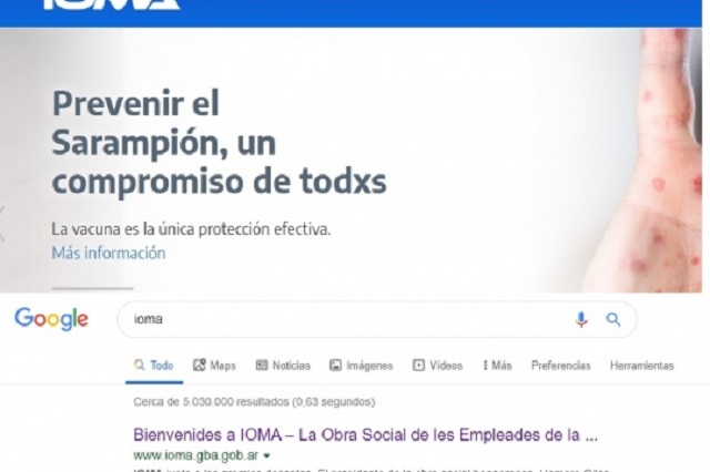 «Bienvenides a IOMA, la Obra Social de les Empleades de la provincia de Buenos Aires», figura en la presentación de la página en Google de www.ioma.gba.gob.ar.