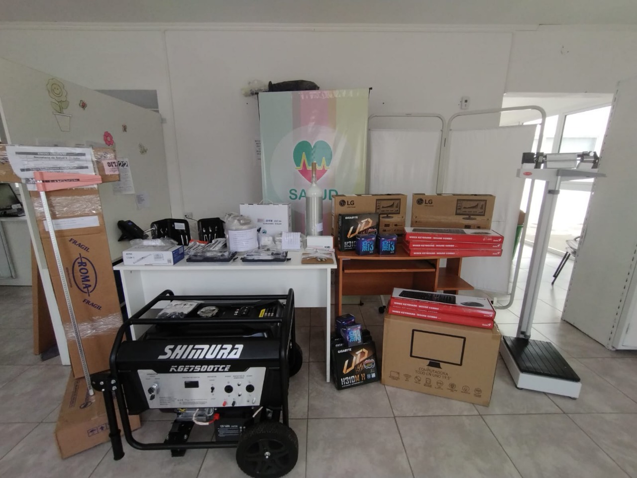 El instrumental y equipamiento adquirido incluye: 2 balanzas con tallímetro, 5 completas, impresoras, teléfonos inalámbricos, un grupo electrógeno, cavitadores, contraángulos, micro-motores, pediómetros, oxímetros pediátricos y oxímetros para adultos, cajas de curaciones completas, tubo de oxígeno portátil de aluminio, tabla plástica de inmovilización espinal, kits de instrumental odontológico rotatorio, otoscopios, tijeras ginecológicas, calefactores y vitro convectores, anafes, mobiliario de oficinas y ventiladores de pie.