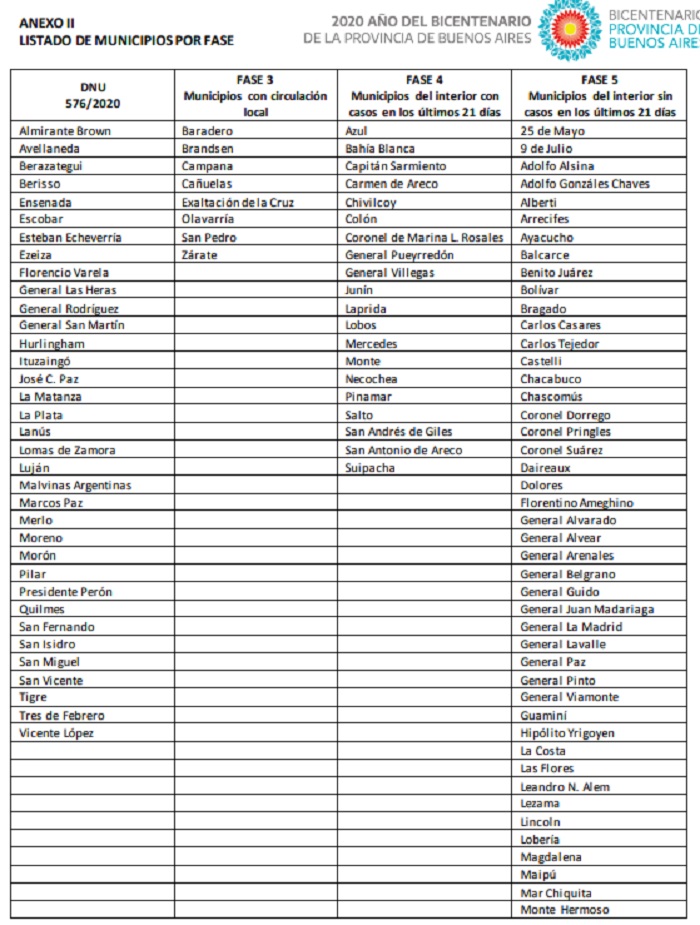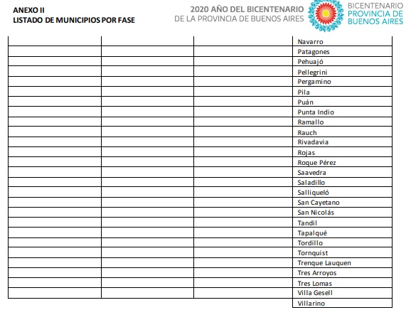 GeneralLas distintas fases de la cuarentena en la Pcia. de Buenos aires2 julio 2020 FacebookTwitterPinterestWhatsAppImpresiónTelegram El gobierno de la provincia de Buenos Aires informó la fase en que se encuentran los distintos municipios bonaerenses. El listado completo.Últimas noticias Agroadmin - 12 diciembre 2025Sociedad Rural: Tiempos difíciles, grandes decisiones Regionales La Justicia ordenó aplicar de inmediato la Ley de Emergencia en Discapacidad admin - 12 diciembre 2025 Deportes Con el clásico de barrio se abre la novena del fútbol nuevejuliense Martin Parise - 12 diciembre 2025 Locales Amenazas y heridas graves de un vecino a otro admin - 12 diciembre 2025 Regionales Emergencia agropecuaria para la provincia de Buenos Aires admin - 12 diciembre 2025 Noticias relacionadas La CGT marchará el 18 de diciembre a la Plaza de Mayo contra la reforma laboral de Milei General admin - 12 diciembre 2025 La inflación de noviembre fue de 2,5% y acumuló 31,4% en los últimos doce meses General admin - 12 diciembre 2025 Patricia Bullrich celebró el límite de horas gremiales y advirtió: «El resto, a laburar» General admin - 12 diciembre 2025 ¿Qué cambia con la reforma laboral? General admin - 11 diciembre 2025