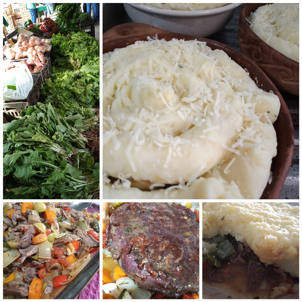 Colocar las verduras cortadas en cubos en una fuente para horno profunda, junto con la carne. La misma tiene que estar en un trozo entero y previamente sellado en una sartén fuerte con aceite. Agregarle a la asadera los líquidos y los condimentos. Taparlo con papel aluminio y cocinarlo a fuego bajo por 1 hora y media. Al cabo de esa hora retirar el papel y volver al horno por 30 minutos más hasta que la carne se deshaga completamente. Preparar un puré condimentarlo a gusto en una fuente que luego será la que lleve a la mesa. Disponer una capa de puré, otra con el relleno de la carne y terminar con el total del puré y queso por arriba para gratinar.