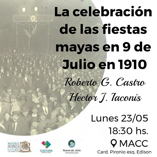Hoy, lunes 23 de mayo, a las 18:30 horas, en el Museo, Archivo Histórico y Centro Cultural “Julio de Vedia”, en el marco de la celebración del nuevo aniversario de la Revolución de Mayo, tendrá lugar una charla titulada “La celebración de las Fiestas Mayas en 9 de Julio en 1910”.