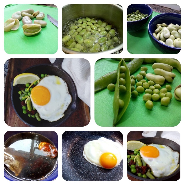 Pelar las habas, las arvejas y llevar a hervor por unos 20 minutos. Una vez tiernas, colar y dejar enfriar. Retirar la película que la contiene, una por una y realizar la ensalada con los demás ingredientes. Finalizar con un huevo, jugo de limón y aceite de oliva.