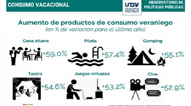 En detalle, el documento destaca los incrementos de precios en los consumos veraniegos: cena afuera, 59%; pileta, 57,4%; camping, 55,1%; teatro, 54,6%; juegos virtuales, 53,2%; e ir al cine, 52,9%.