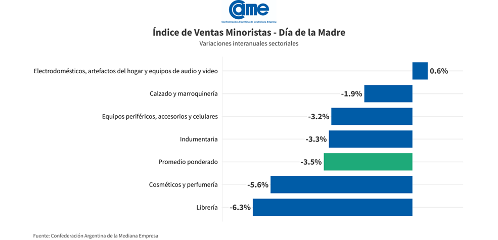 Las ventas en los comercios minoristas pymes durante el Día de la Madre mostraron una retracción del 3,5% frente al mismo período del año anterior, medidas a precios constantes. Se trata del cuarto descenso interanual consecutivo, asociado al deterioro del poder de compra de los hogares y a una fecha que, en la actualidad, no logra impulsar de manera significativa el consumo minorista.