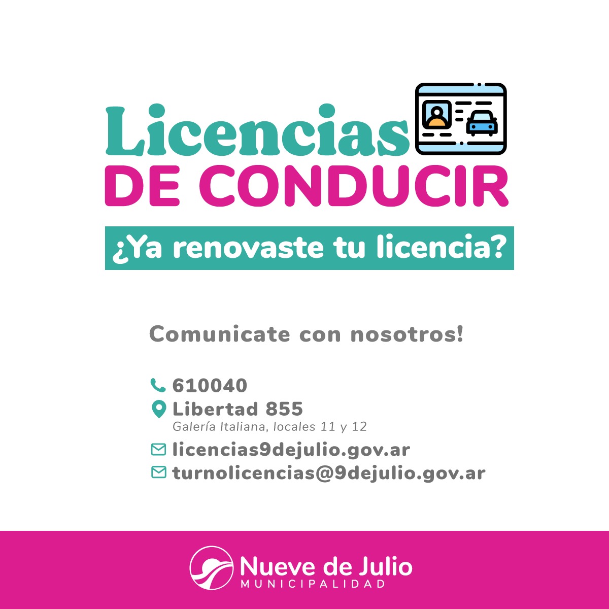 La Oficina de Licencias de Conducir de la Municipalidad de Nueve de Julio informa que, mediante la Resolución Nº 197/2024 Circular Nº 4, se habilita a conducir con la constancia de Trámite Aprobado, y la Licencia Digital, que se encuentra en la aplicación MI ARGENTINA, hasta el 15 de octubre del corriente año.