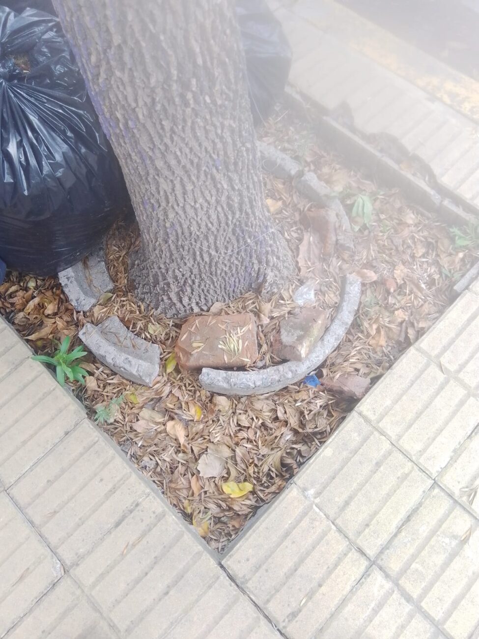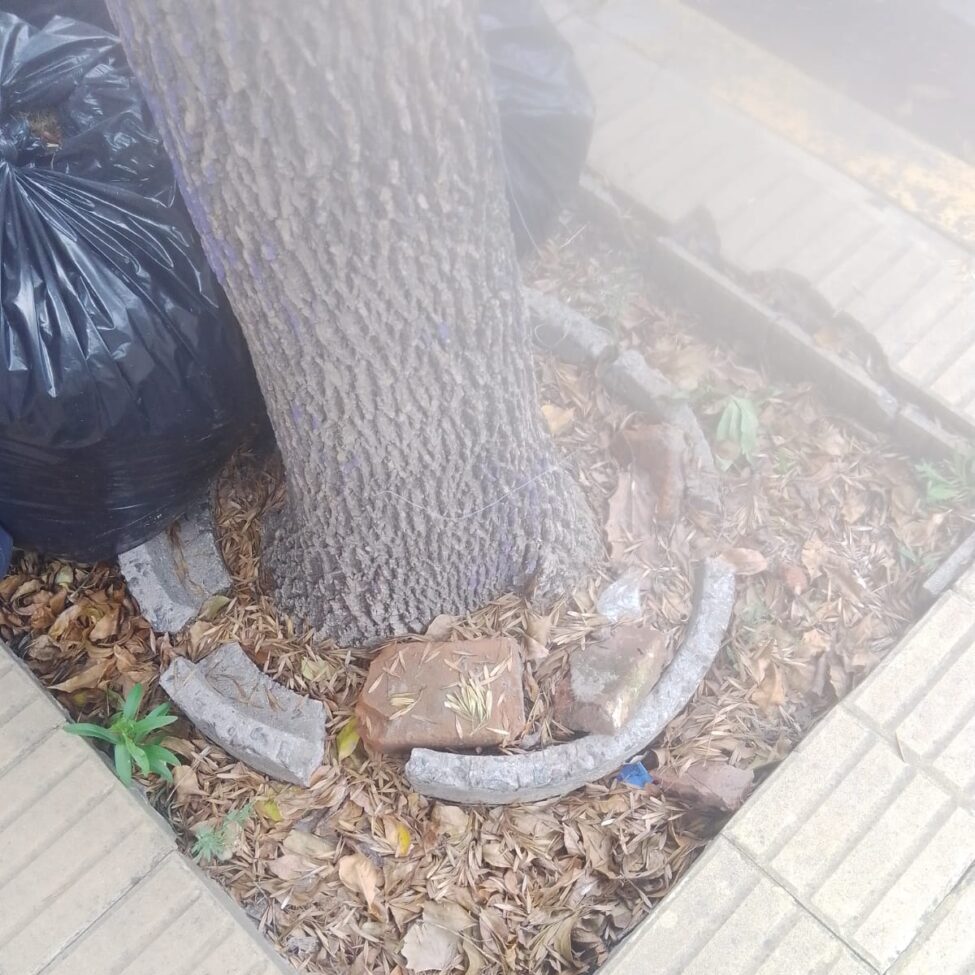 * Sistema radicular: los sistemas en cabellera superficiales, si buscamos llevarlos a profundidad hace que se comprima y someter a una presión hasta lograr la rotura como muestra la foto, ese árbol hoy ve dificultado su nutrición y absorción de agua por haberle errado en lo qué se le puso.