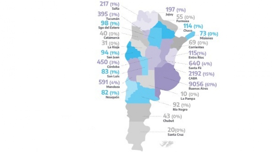La mayor cantidad de intervenciones por violencia de género que se hicieron en la primera mitad del año fueron en la Provincia de Buenos Aires (61%). Le siguen la Ciudad de Buenos Aires (15%) y luego Mendoza y Santa Fe (4%), y Tucumán y Córdoba (3%). Aunque el resto de las provincias registran poca intervención de la Línea 144, en todas queda manifiesta la existencia de violencias hacia las mujeres.