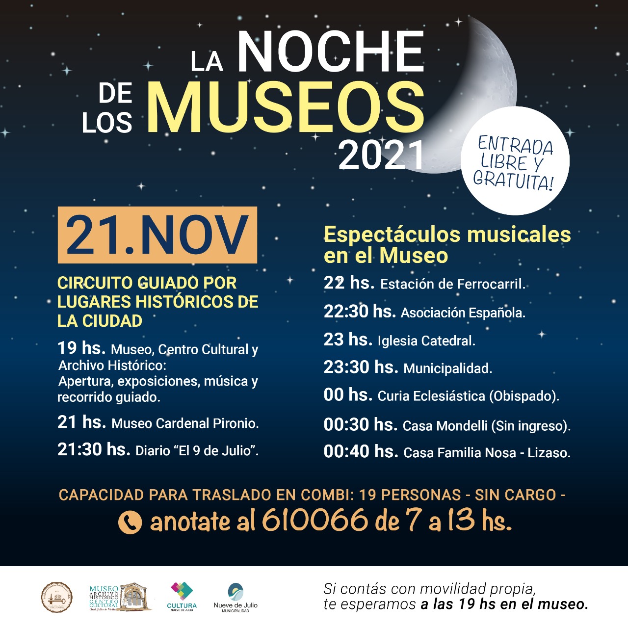 Se dispondrá de capacidad para traslado en combi para 19 personas sin cargo, pudiendo inscribirse los interesados al 610066, de 7 a 13 hs.; mientras que quienes cuenten con movilidad propia podrán acercarse directamente al Museo.
