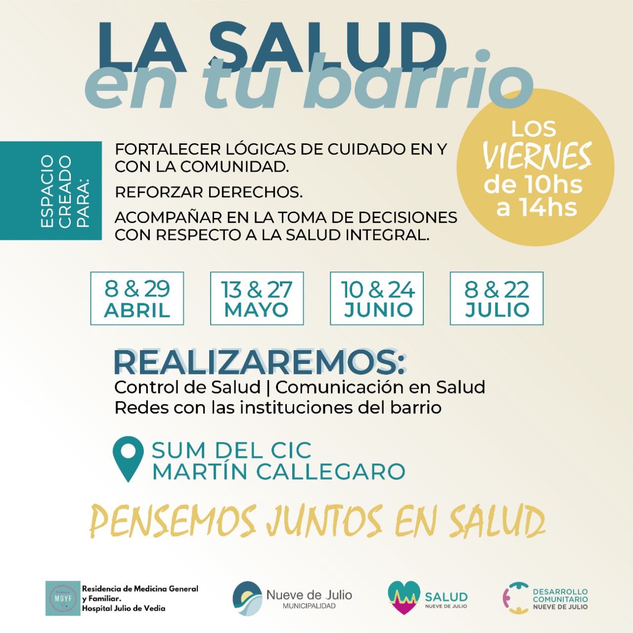 Desde las Secretarías de Salud y Desarrollo Comunitario de la Municipalidad de Nueve de Julio, continuará desarrollándose este próximo viernes 24, de 10 a 14 hs., el programa denominado “La salud en tu barrio”, que persigue el objetivo de fortalecer las intervenciones territoriales en pos del derecho a la salud de la comunidad, abarcando la toma de presión arterial, toma de glucemia, testeo de sífilis y HIV y control de libreta de vacunación.