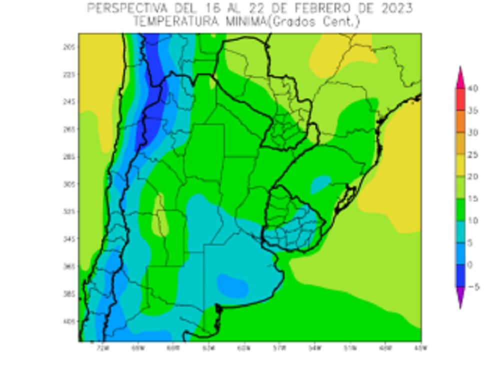 La perspectiva agroclimática de la semana del 16 al 23 de febrero comenzó con vientos del Trópico poco vigorosos provocando temperaturas máximas en el rango normal en la mayor parte del área agrícola, con focos aislados de calores fuertes sobre el interior del área agrícola, y bajo lo normal sobre el Litoral Atlántico.