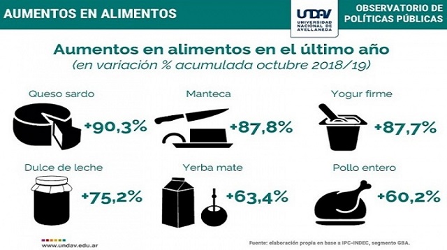 El Observatorio de Políticas Públicas de la Universidad Nacional de Avellaneda (UNDAV) reveló que, los precios de los alimentos aumentaron hasta un 90% entre octubre de 2018 y octubre de 2019.