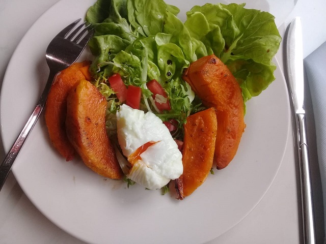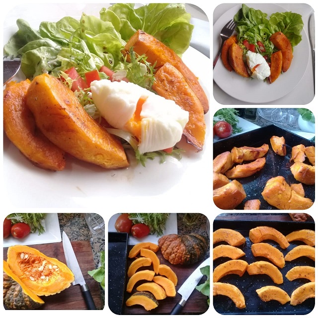 Cortar el zapallo en lonjas pelarlos y llevar a horno por 35 minutos, hasta que estén listos y dorados. Preparar las hojas verdes bien lavadas y disponerlas sobre la base del plato para servir. Realizar un huevo poche, escalfado o hervido. Cortar los tomates en cubos y disponer todos los ingredientes para formar la ensalada. Terminar con una vinagreta de aceite de oliva aceto balsámico y sal.