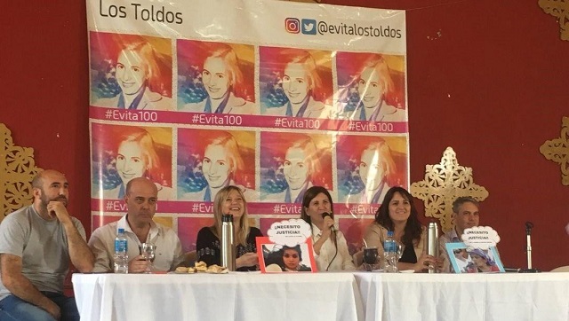 En este marco, señaló que la celebración del Centenario de Evita «nos encuentra en un momento muy particular de la realidad». «Quienes nos vamos a convocar el 7 de mayo en Los Toldos, somos quienes estamos junto al pueblo resistiendo a los tarifazos, juntos a las y los docentes que reclaman porque se les reconozca el valor de su trabajo y por un salario digno, quienes acompañamos en las plazas a los jubilados que desean vivir una vejez digna. Quienes estamos en contra de los despidos que día a día llevan a cabo los gobiernos de Cambiemos, quiénes acompañamos en estos momentos difíciles a nuestros comerciantes y productores», agregó.