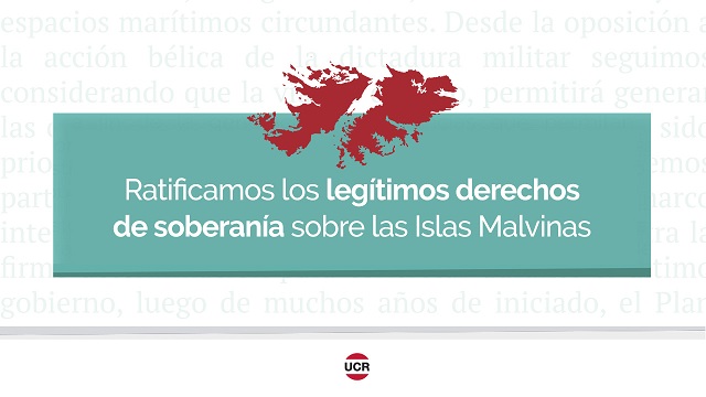 La Unión Cívica Radical, a 187 años de la ocupación ilegal de las islas, por parte del Reino Unido, ratifica los legítimos derechos de soberanía sobre Malvinas, Georgias del Sur, Sandwich del Sur y los espacios marítimos circundantes.