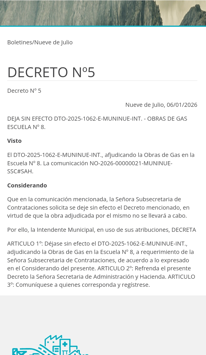 Según pudimos conocer de muy buena fuente, que la Intendente Maria José Gentile, consultada sobre el tema, dijo que ella “no habia dado de baja la obra” desconociendo el Decreto. Lo cual hace más complicado el tema ya que si se publica un Decreto, que es una herramienta del Ejecutivo, con mención a la Intendente y dice «Por ello, la Intendente Municipal, en uso de sus atribuciones, DECRETA», la pregunta es ¿quién está a cargo? Cómo se publica EN EL BOLETIN OFICIAL con fecha 6 de enero 2026 un decreto del Ejecutivo y la Intendente lo desconoce?