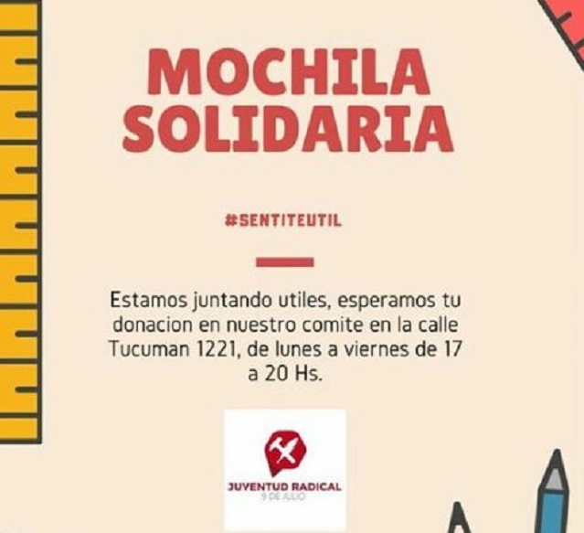 La Juventud Radical del distrito de Nueve de Julio, realizará una campaña solidaria, para que este comienzo de clases a ningún chico le falten los elementos necesarios para la Escuela.