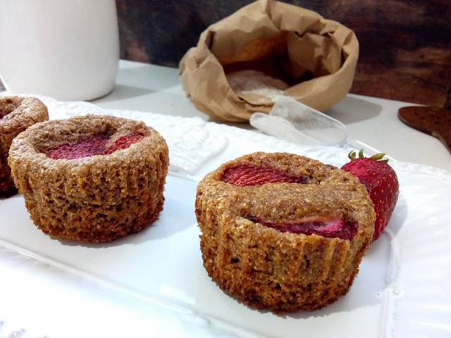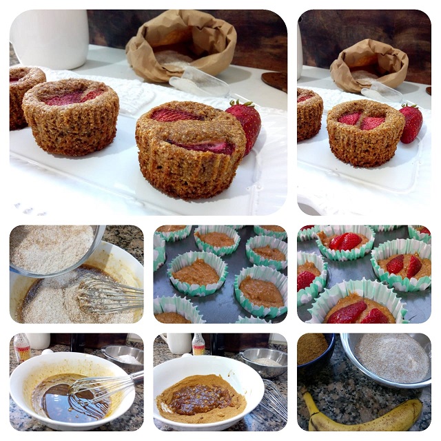 En un bowl pisar la banana, agregar el azúcar, la leche y el aceite. Incorporar la esencia de vainilla junto con los secos y terminar con las claras batidas a nieve. Llevar al horno el pirotines de muffins, colocar rodajas de frutas por encima y cocinar por 35 minutos a 160°. La cocción de productos con esta clase de harina debe ser húmeda. Agregando frutas ayudamos a mantener esa humedad y el resultado final es sumamente delicioso.