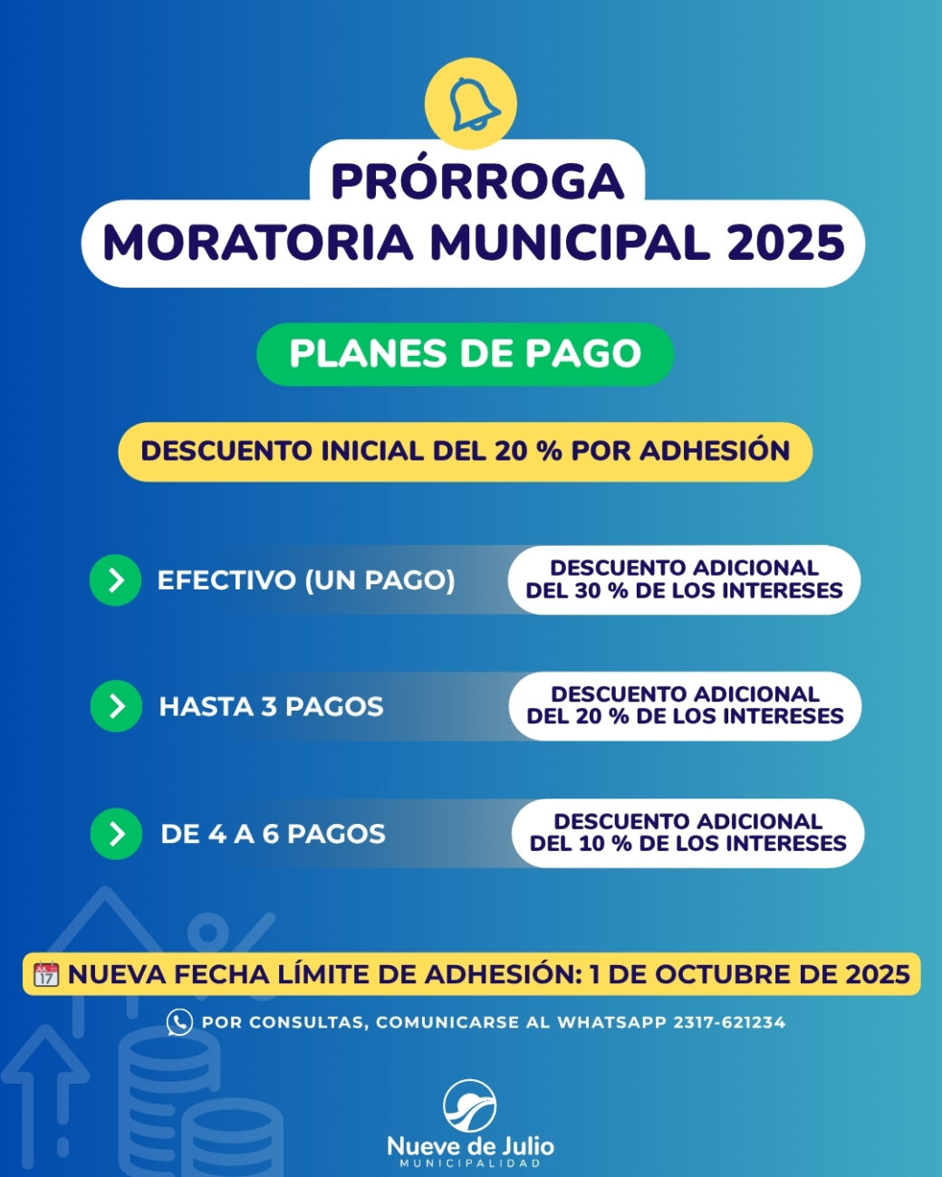 La Municipalidad de Nueve de Julio prorrogó hasta el 1º de octubre el plazo para adherirse al Plan de Regularización de Deudas. Los que tengan impuestos o tasas pendientes, tiene esta oportunidad para ponerse al día con importantes beneficios.