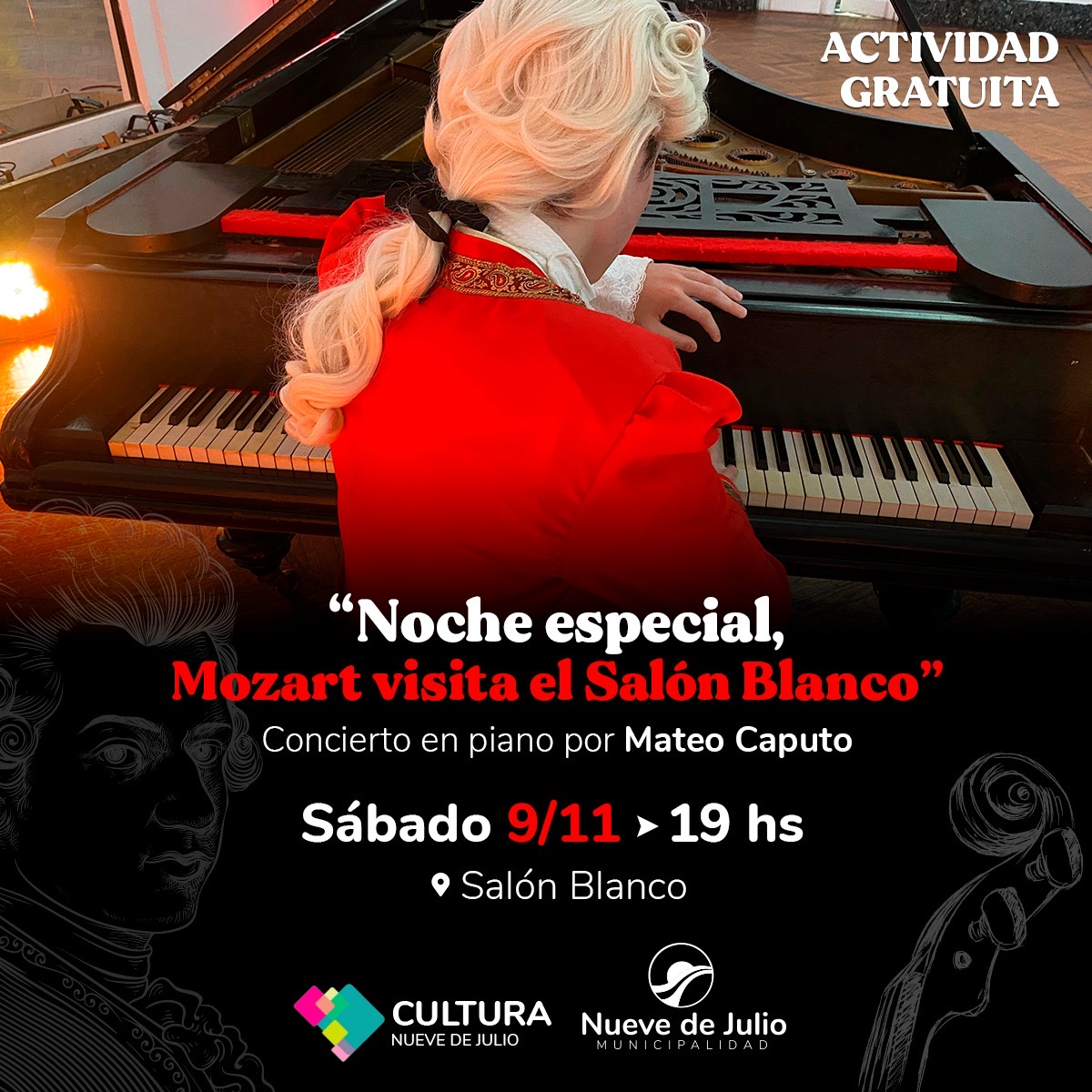 El próximo sábado 9 de noviembre, a las 19 hs., en el Salón Blanco Municipal se presentará el joven pianista nuevejuliense Mateo Caputo, quien brindará un concierto especial en el que interpretará obras de Wolfgang Amadeus Mozart, entregando una gran oportunidad para los amantes de su música y para quienes no lo conocen, de poder ampliar su apreciación artística y musical, aprendiendo al mismo tiempo sobre su vida, personalidad y aspecto.