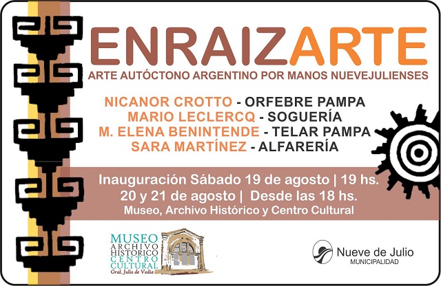 Desde mañana, sábado 19, a las 19 hs., se pondrá en marcha en el Museo, Archivos Histórico y Centro Cultural “Julio de Vedia” la muestra de arte autóctono argentino por manos nuevejulienses denominada “Enraiz-arte”; la que continuará el domingo 20 y lunes 21, desde las 18 hs.