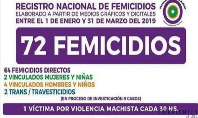 Según el registro Nacional de Femicidios del Observatorio MuMaLá, realizado a partir de medios gráficos y digitales, entre el 1 de enero y el 31 de marzo, una mujer fue asesinada cada 30 horas.