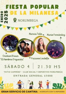 La Fiesta popular de la Milanesa en Norumbega abre el sprint festivo de las localidades en el Partido de 9 de Julio. Quinta edición de un evento bajo las estrellas que se realiza en el patio campero de la sede del Club Social y Deportivo de esa pequeña localidad.
