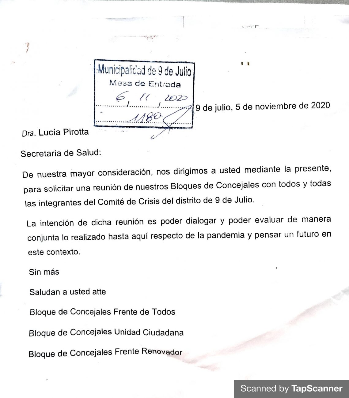 El pasado 6 de noviembre se presentó una nota en el palacio municipal dirigida a la Secretaría de Salud solicitando, desde los tres bloques de concejales correspondientes a la oposición, una reunión con todos los y las integrantes del comité de crisis.