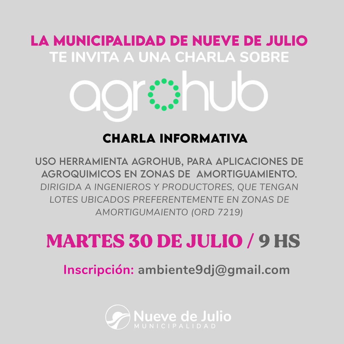La Municipalidad de Nueve de Julio, a través de la dirección de Gestión Ambiental, invita a ingenieros agrónomos y productores que tengan sus lotes preferentemente en la zona de amortiguamiento (Ordenanza 7219) a una nueva charla informativa virtual sobre la utilización de la aplicación AGROHUB, que permite presentación de recetas, seguimiento de aplicaciones de agroquímicos y emisión de actas de condiciones técnicas.