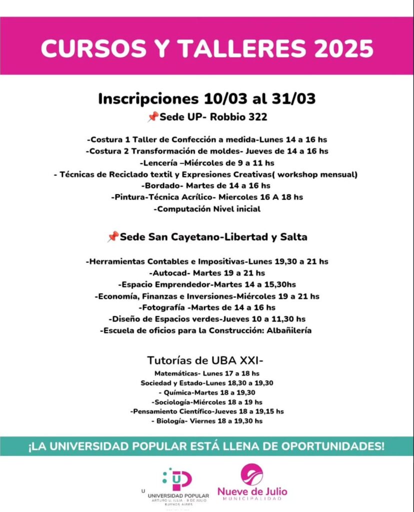 Con una nuevas propuestas de formación, pensadas con salida laboral, la Universidad Popular de 9 de Julio ya tiene cerrada su lista de talleres.