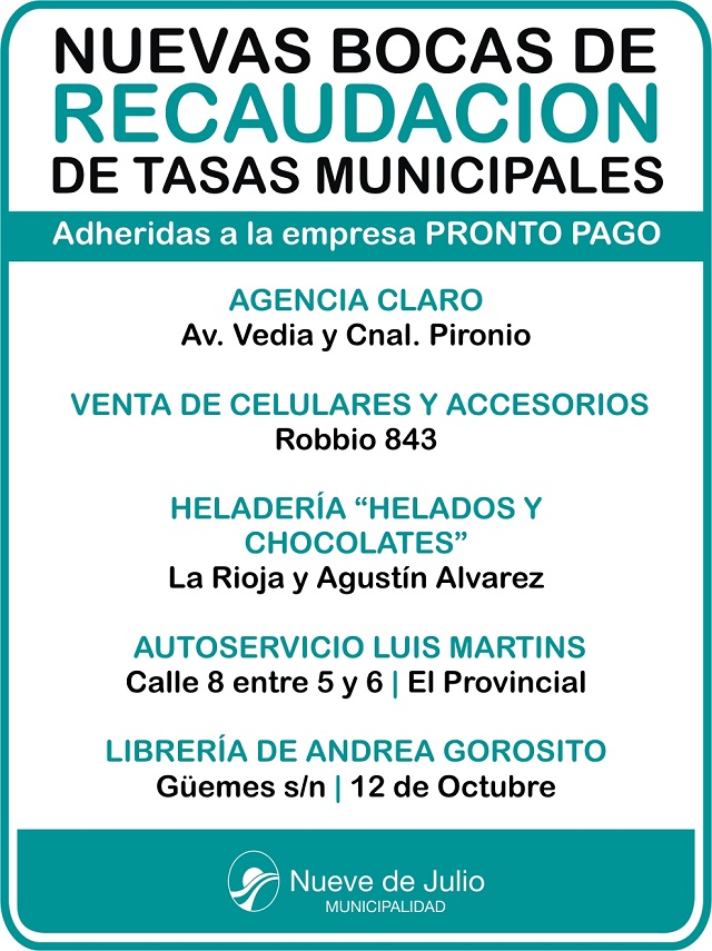 La Municipalidad de Nueve de Julio, a través de la Secretaría de Administración y Hacienda, informa a la comunidad que a partir del mes de abril, se incorporarán nuevas bocas de recaudación de tasa municipales adheridas a la empresa “Pronto Pago”, siendo las mismas: