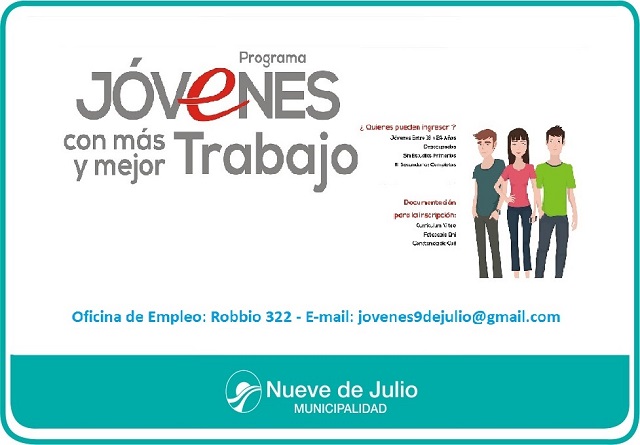 La Oficina de Empleo de la Municipalidad de Nueve de Julio informa los alcances del programa “Jóvenes con más y mejor trabajo”, del Ministerio de Trabajo, Empleo y Seguridad Social de la Nación, y destinado a vecinos de 18 a 24 años que no finalizaron los estudios secundarios (cursando o incompletos).