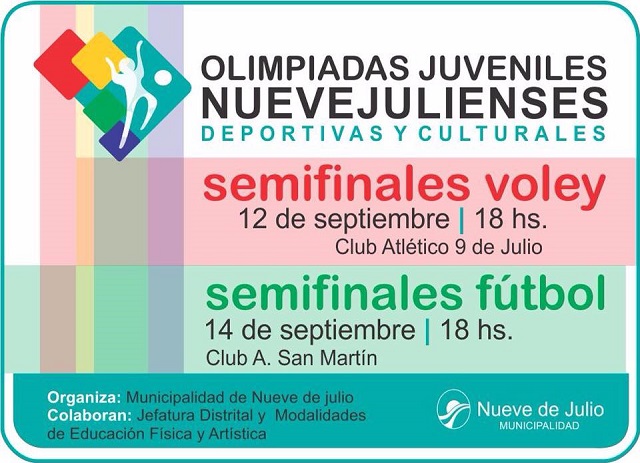 La Dirección de Deportes de la Municipalidad de Nueve de Julio recuerda que hoy se realiza la semifinal de voley en el Club Atlético 9 de Julio, dado que por las incidencias climáticas la cancha del Club San Martín se encuentra con mucha agua, por lo que decidió adelantarse el Voley, mientras que el jueves se disputará el futbol.