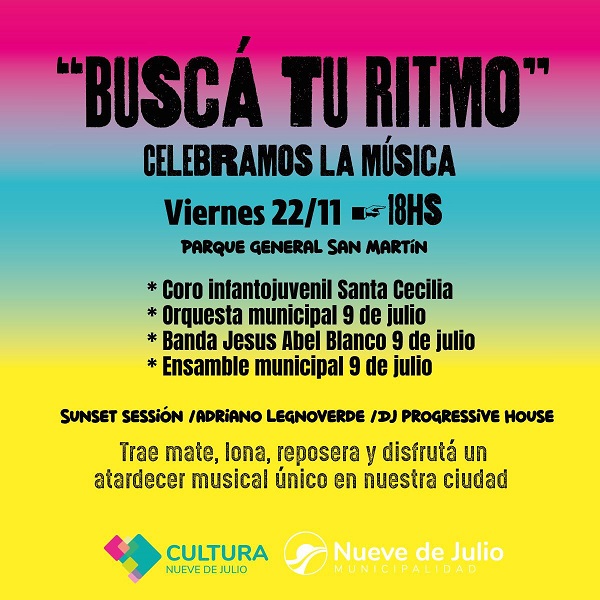 Para celebrar el Día de la Música, la dirección de Cultura, invita al evento “Buscá tu ritmo”, que se desarrollará el viernes 11 del corriente, a las 18h en el Parque General San Martín.