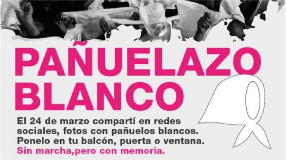 Las organizaciones de derechos humanos que todos los años convocan a una marcha por “Día Nacional de la Memoria por la Verdad y la Justicia”, este año a raíz del coronavirus, proponen celebrarlo compartiendo en redes sociales “fotos con pañuelos blancos”, además de ponerlos en el balcón, puerta o ventana de cada casa. “Sin marcha pero con memoria”