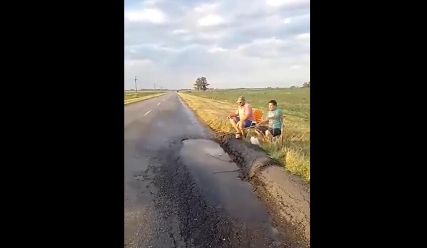 Lo llamativo de su filmación, es que no se encuentra pescando en alguna laguna, canal o puente a la vera de la ruta como suele suceder cotidianamente sino que “tiró la línea” sobre el agua acumulada en un bache de la ruta.